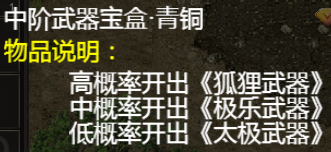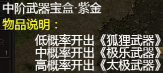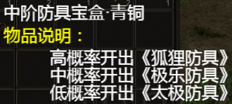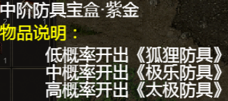 武器防具盲盒分别有,青铜,钻石,紫金,三种不同级别,级别越高的盲盒开出高级武器防具的概率也会更高。